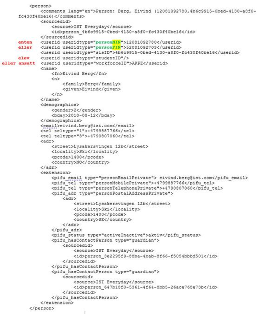 <userid useridtype="personNIN">12081192780</userid> - sisID - ID i skoladministrasjonssystemet (GUID)