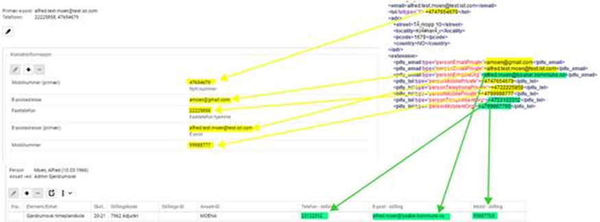 - Grønt markerer personens kontaktinformasjon tilknyttet organisasjonen