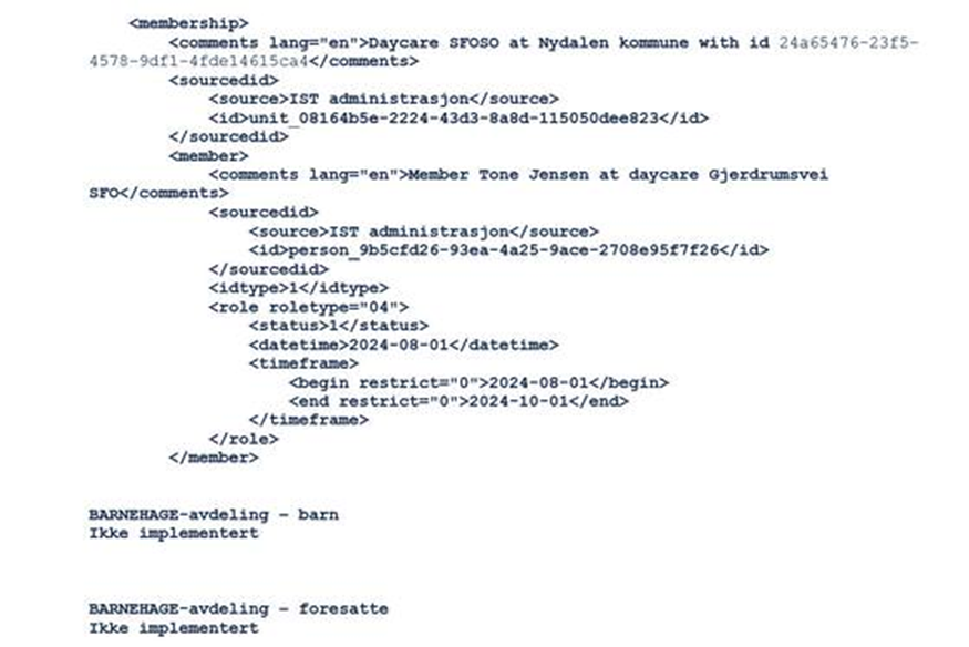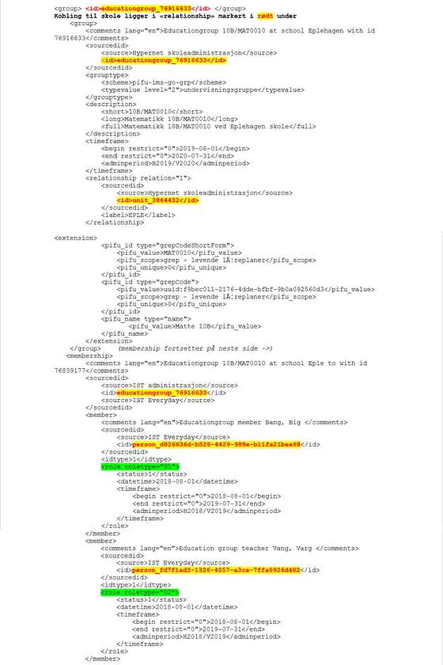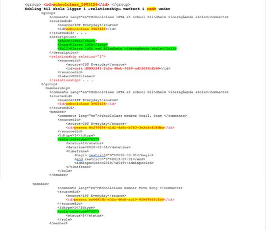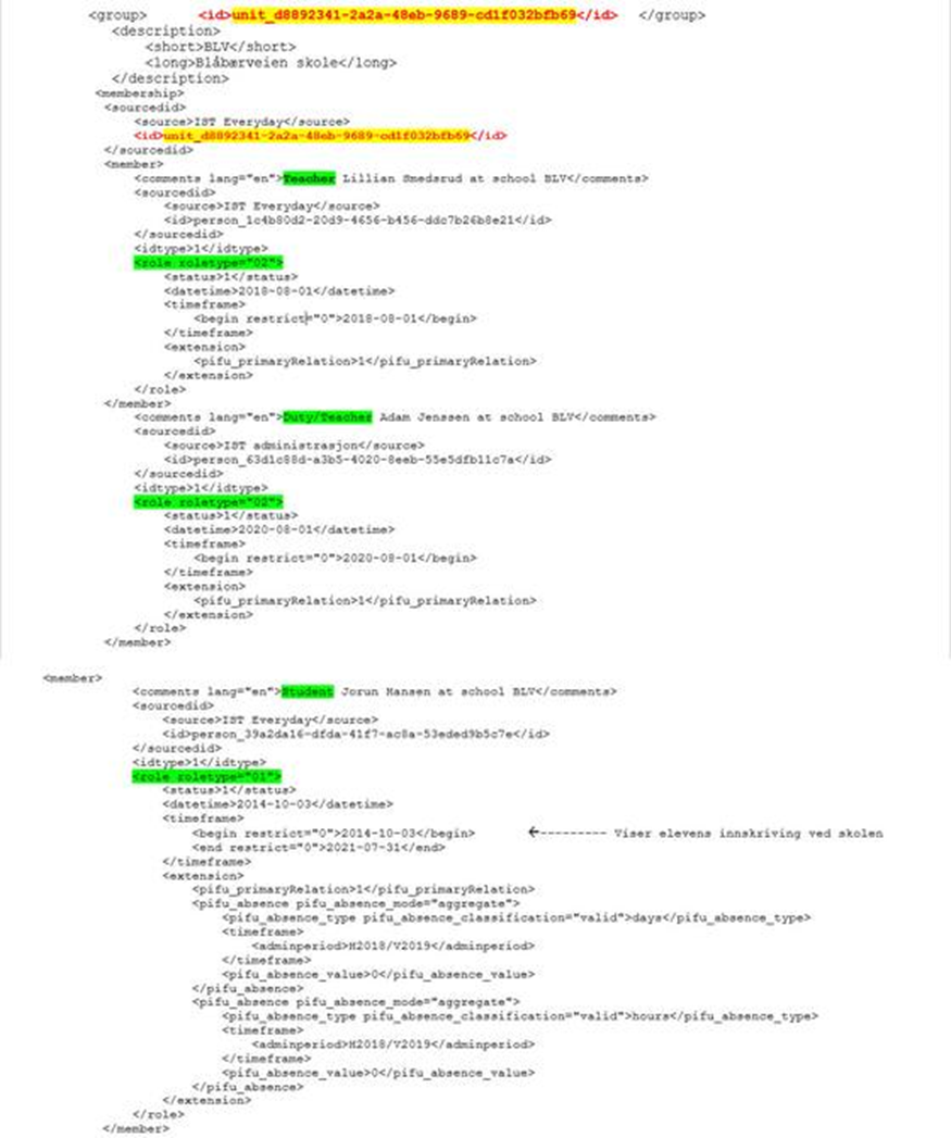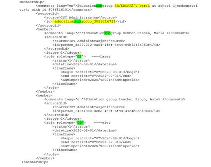 Generelt om medlemskap Membership og member Status: 1= Aktiv 0= Passiv Alle avsluttede medlemskap (<member>) eller ikke påbegynte medlemskap vil også være med i uttrekket ut skoleåret slik at disse kan avsluttes i eksterne systemer på en enkel måte. Eksempelet nedenfor viser en elev som er medlem av klasse 9A ved Eplehagen skole angitt ved roletype 01-Learner - Elev 02-Instructor – Lærer, pedagoger, sfoansatt 04-Member - Medlemmer (andre ansatte, foresatte) NB! Adminperiod er det samme som skoleår og angis med prefix med H (høst) og V (vår)