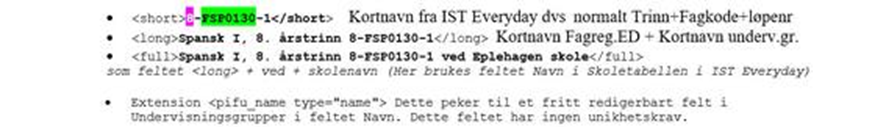 Nytt felt i Undervisningsgruppe under «extension»-tagg: «name». Dette henter data fra feltet Navn i undervisningsgruppe og er redigerbart for brukerne. Merk! Det er ingen unikhetskontroll på dette feltet i IST Everyday.