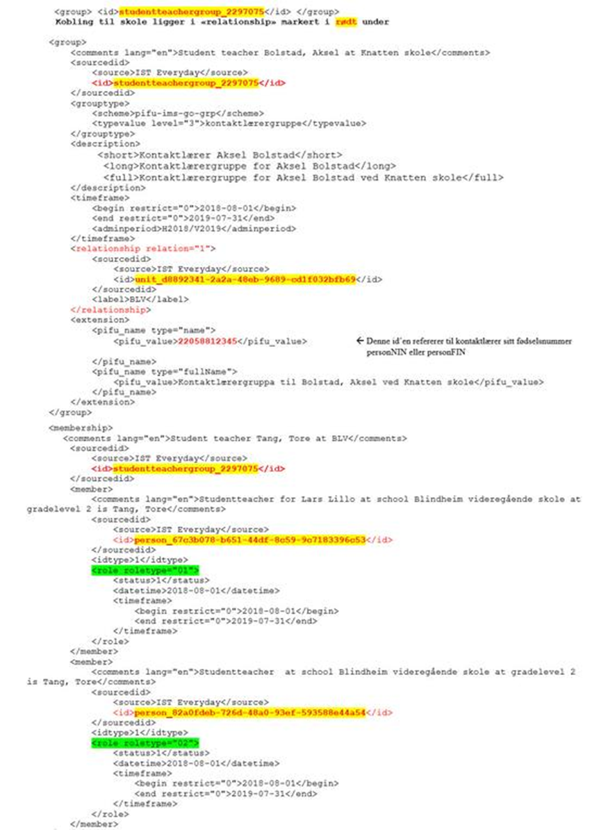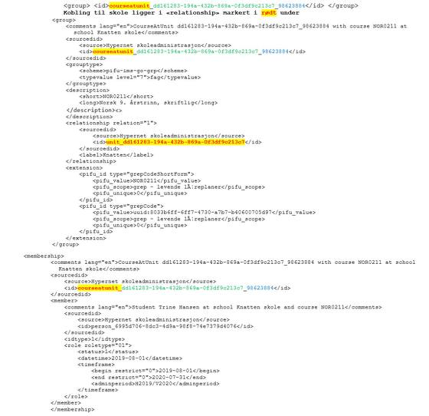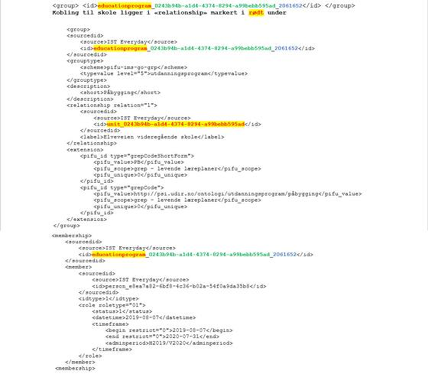 PIFU-IMS baserer seg på knytninger gjennom feltet <id>. F.eks. har elevene en relasjon til medlemskap til sine foresatte gjennom feltet <id>.