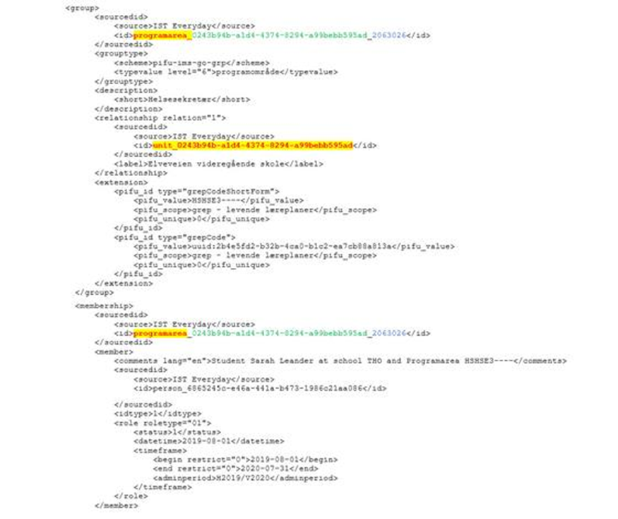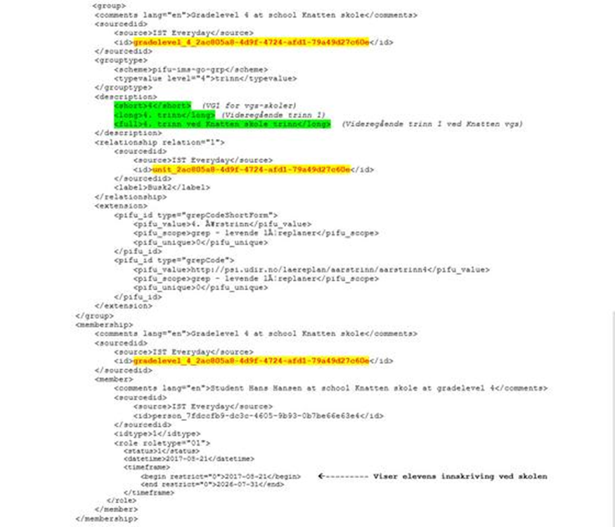 - Medlemskap inneholder member sin: Start og sluttdato - benyttes til å melde elever, lærer og andre inn og ut av grupper i eksterne systemer