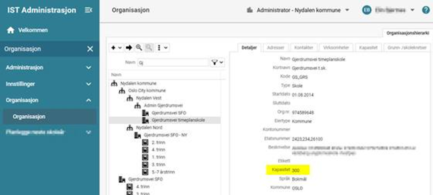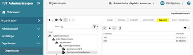 Det registreres startdato for kapasiteten, slik at det er mulig å endre over tid og fortsatt beholde historikken. Kapasitet registreres på egen fane Kapasitet, og vises på fanen Detaljer:
