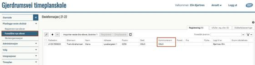 Når registreringen av grunnkretser er ferdig er koplingen mellom elev og skole klar. Resultatet vises umiddelbart for mottakerskolen under Planlegge neste skoleår – Foreslåtte nye elever. Elevene vises fordi de er importert fra folkeregisteret og allerede ligger klare i personregisteret med grunnkrets. De vises med foreslått årstrinn 1 på bakgrunn av fødselsår. Det kan naturlig nok ta litt tid å hente opp alle de nye elevene ettersom alle personer i databasen sjekkes for fødselsnummer og grunnkrets.