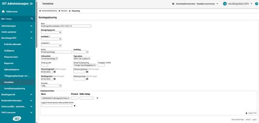 Søknad behandles på vanlig måte ved å gå til Barnehage/SFO > Venteliste. Det opprettes også tilbud på vanlig måte som foresatte besvarer. Når tilbudet er besvart, går du til Venteliste > fane Plassere.