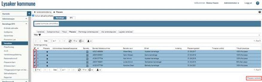 Det er mulig å plassere flere barn samtidig. Marker barna og klikk på Plassere markerte: