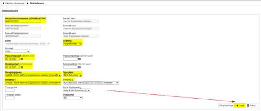 Skriv inn fødselsnummeret til barnet og legg inn Plasseringsstart, Betalingsstart, Avdeling, Type plass, Beregningsgrunn, Inntektsid 1 (og eventuelt Inntektsid 2)