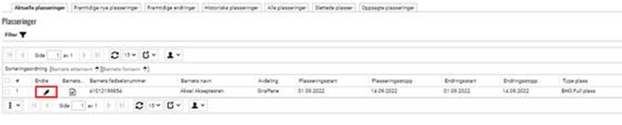 Gå til Barnehage/SFO > Plasserte barn og klikk på endreikonet på plasseringen: