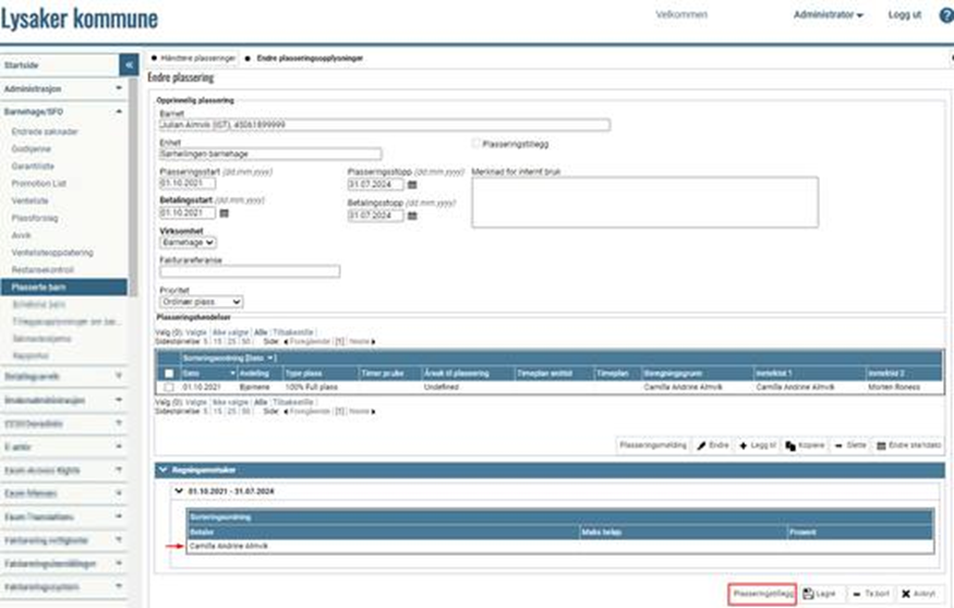 Husk at datoer for plasseringstillegget må være i en periode barnet er plassert. Det er også viktig at datoene for plasseringstillegget er i den måneden som skal faktureres. Eksempel: Dersom barnet hadde et plasseringstillegg i februar, men februar allerede er fakturert, så ønsker du å få med plasseringstillegget på marsfaktureringen. Datoene for plasseringstillegget må dermed legges inn mars for å komme med. Har du allerede laget plasseringtillegget på februar etter februarfaktureringen er kjørt, må dette slettes, og nytt plasseringstillegg for neste faktureringsperiode opprettes.