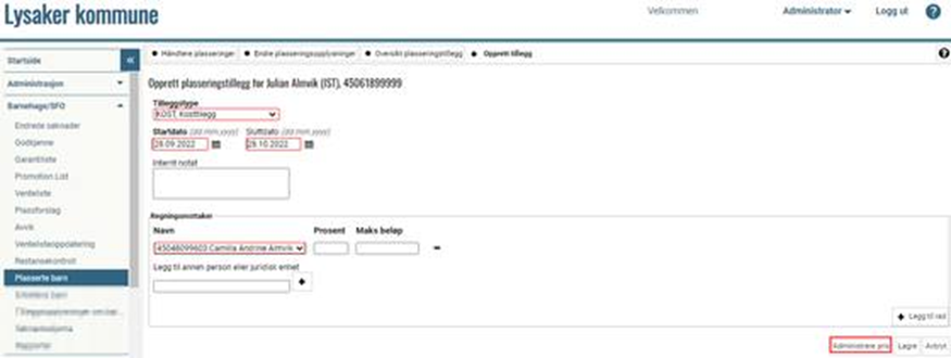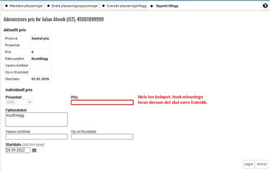 Dersom beløpet som skal knyttes til plasseringstillegget ikke er et fastbeløp som allerede er knyttet til avvikstypen som enten sentral pris eller enhetspris, benyttes knappen Administrere pris. Fakturateksten kan tilpasses.