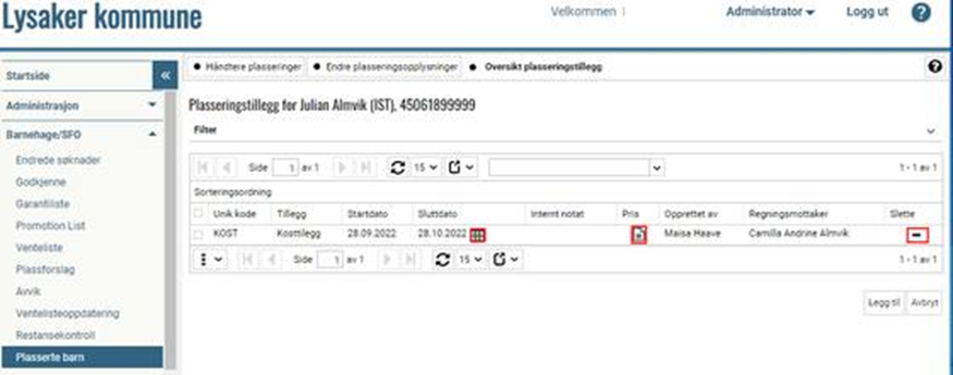 Er annet enn sluttdato registrert feil, må plasseringstillegget slettes ved hjelp av ikonet i kolonnen Slette, og nytt plasseringstillegg må registreres med riktig informasjon.