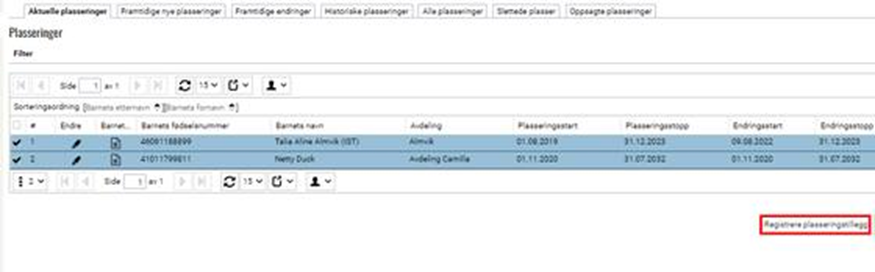 Tillegg eller fratrekk på en faktura utføres i Barnehage/SFO > Plasserte barn. Merk de barna som skal ha plasseringstillegget.