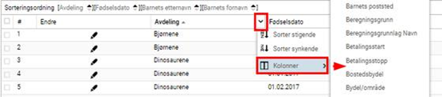 Du kan hente fram eller skjule kolonner som skal vises i skjermbildet. Trykk på den lille pilknappen på en kolonneoverskrift: