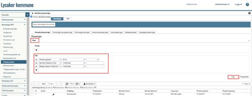 Benytt filterfunksjonaliteten for å bestemme hvilke barn som skal vises i listen. Du kan fjerne (med minusknappen) eller legge til (med plussknappen) en rekke ulike filter før du trykker på Vise: