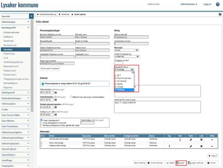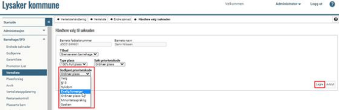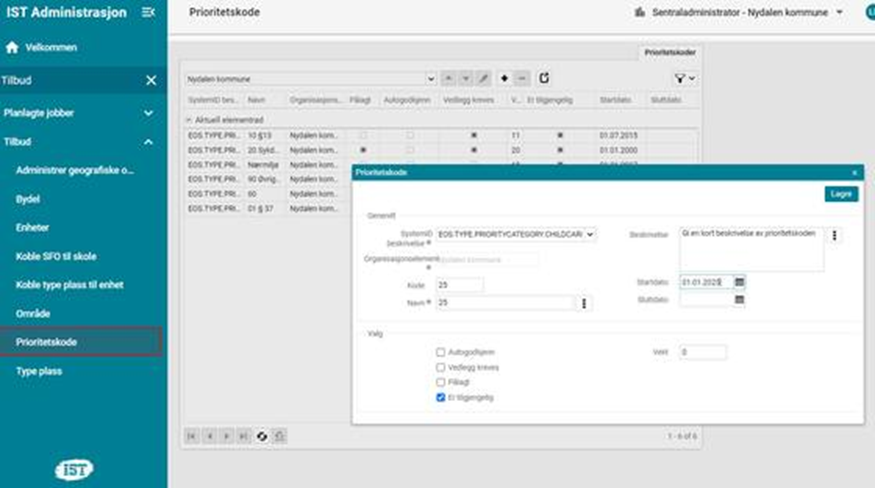 Registrer godkjent prioritetskode og klikk på Lagre: