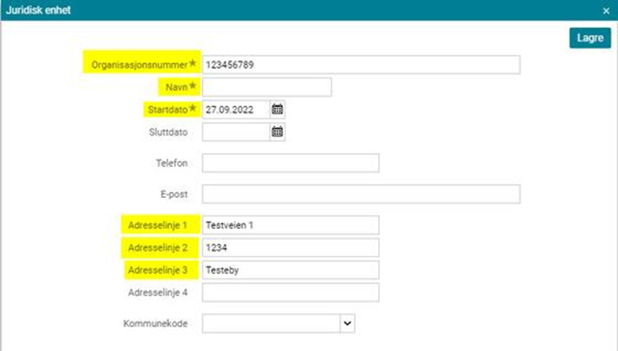 dersom ny juridisk enhet skal registreres. Registrer organisasjonsnummeret, navn, adresse (Adresselinje 1), postnummeret (Adresselinje 2) og poststedet (Adresselinje 3). Klikk på Lagre: