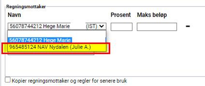 Hvis du gjør endring på regningsmottakeren og det finnes fremtidige endringer på plasseringen (f.eks. bytte av avdeling, endret type plass e.l.), hak av ved Kopier regningsmottaker og regler for senere bruk, avslutt med å velge Fortsett og deretter Lagre.