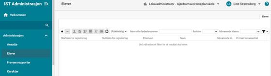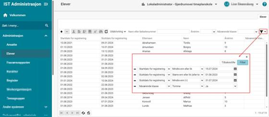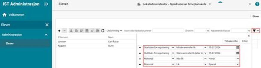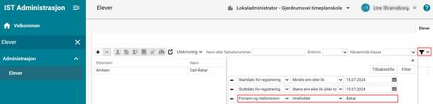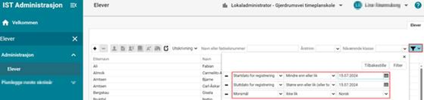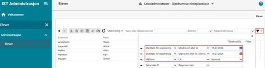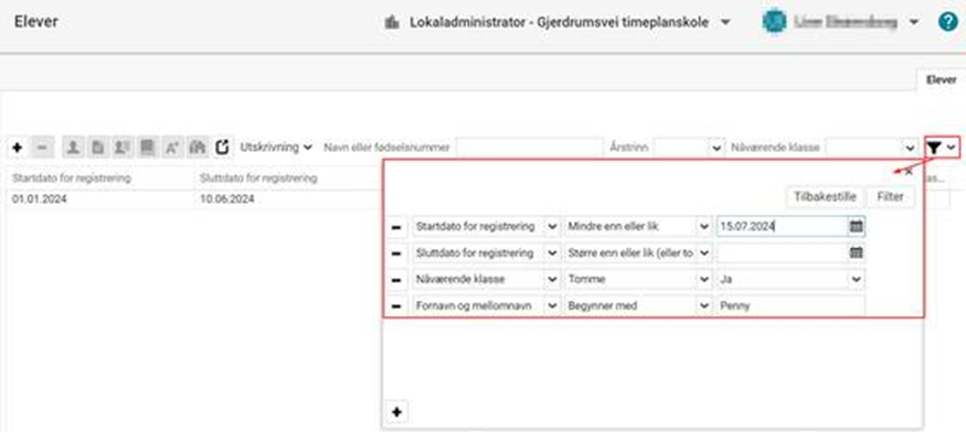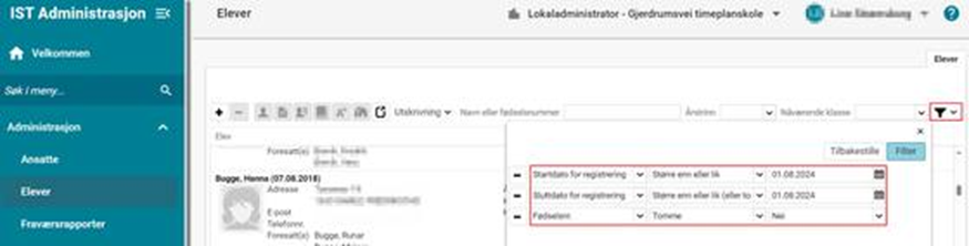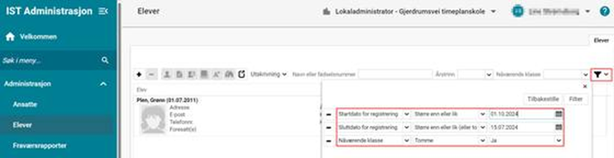 Eksempel 2 Jeg vil finne en elev som skal begynne på skolen. Vet at eleven er skrevet inn, men husker bare at eleven starter i oktober en gang: Administrasjon > Elever > Filter: Setter startdato større enn eller lik 01.08.2024, lar sluttdato være uendret og legger til enda ett kriterie (f.eks. Nåværende klasse - Tomme - Ja):