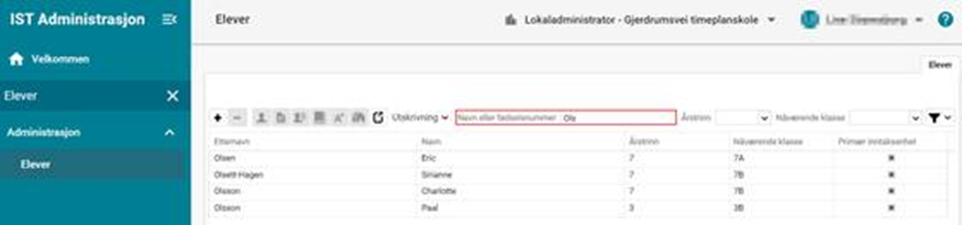 Det er enkelt å søke etter elev med hurtigsøkfeltet, da trenger du hele eller starten på elevens etternavn, fødselsnummer eller fornavn. Skriv dette i hurtigsøkfeltet og trykk på Enter. Se det første bildet nedenfor, her fikk jeg et resultat på fire elever som har et etternavn som begynner på Ols.