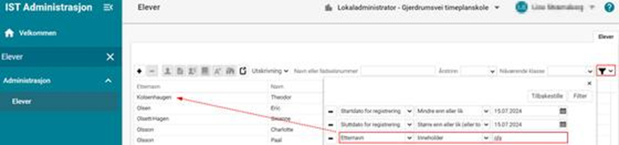 Det kan noen ganger være lurt å benytte Filter-funksjonen i stedet for hurtigsøk. Jeg får et annet resultat om jeg filtrerer på Etternavn - Inneholder - ols. Som du ser i det andre bildet nedenfor får jeg et resultat på fem elever som har et etternavn som inneholder ols:
