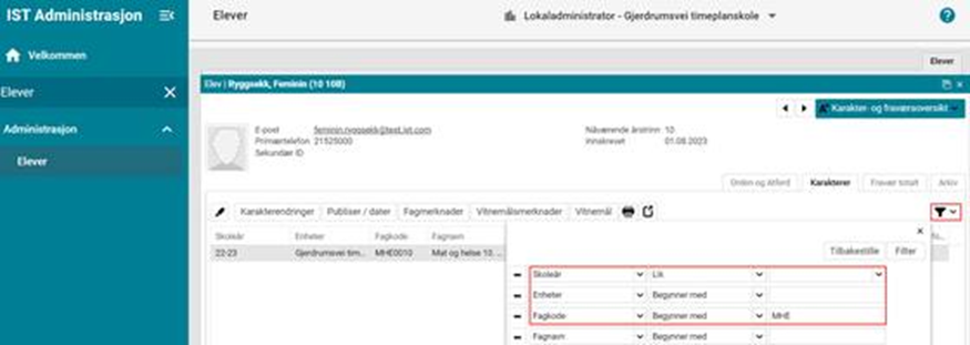 Eksempel 2 Jeg vil se alle elevens karakterer i ett bestemt fag uavhengig av skoleår: Samme filter som ovenfor, men legg til ett kriterie. Fagkode - Begynner med - skriv inn de første bokstavene i fagkoden, for eksempel MHE hvis jeg leter etter Mat og helse som i dette eksempelet: