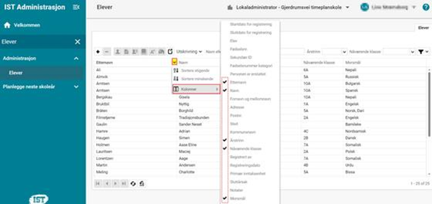 I elevregisteret kan det noen ganger være mer oversiktlig å endre visningen slik at du kan se flere elever i liste. Du kan endre kolonnevisning ved å klikke på den lille pilen på en av kolonneoverskriftene og deretter hake av ved de kolonnene du ønsker å se i visningen (hvis du ønsker å hente tilbake den "vanlige" visningen av elevkortet senere, kan du hake av for Elev og fjerne hakene ved Etternavn og Fornavn)