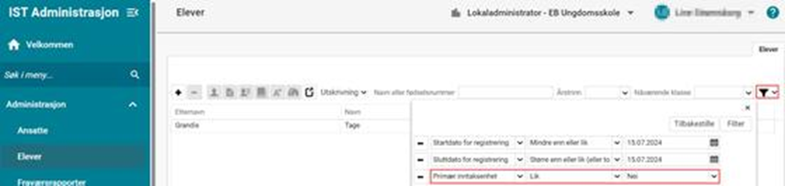 Feltet Primær inntaksenhet er viktig blant annet i forbindelse med rapportering til GSI. For å finne ut om det er registrert inn elever uten denne markeringen, gå til Administrasjon > Elever > hent fram kolonnen Primær inntaksenhet. Sett filter: