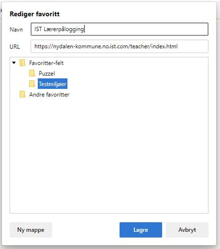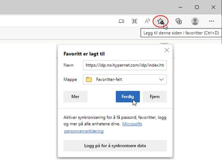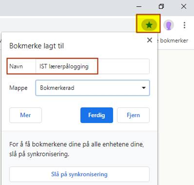 Lagre denne lenken som en favoritt ved å trykke på stjernen. Du kan gi snarveien et navn og velge hvor du ønsker å legge snarveien (f.eks. i favorittfeltet eller i en mappe). Klikk på knappen Ferdig for å lagre: