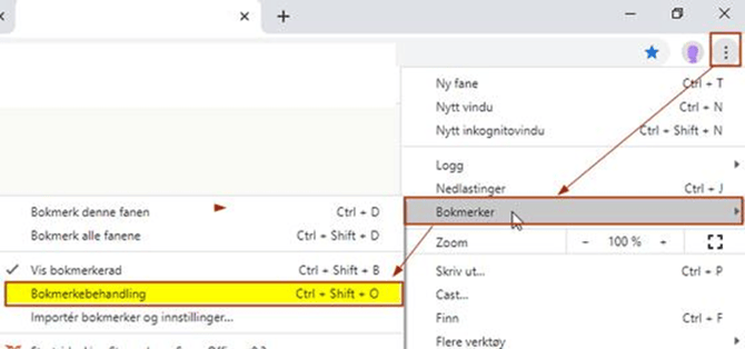 Du skal nå redigere bokmerket slik at du får inn riktig URL. Gå til Tilpass og kontroller Google Chrome (knapp med tre prikker) - Bokmerker - Bokmerkebehandling: