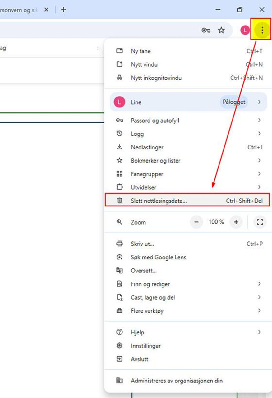 Trykk på Tilpass og kontroller Google Chrome (knapp med tre prikker) Trykk på Slett nettlesingsdata: