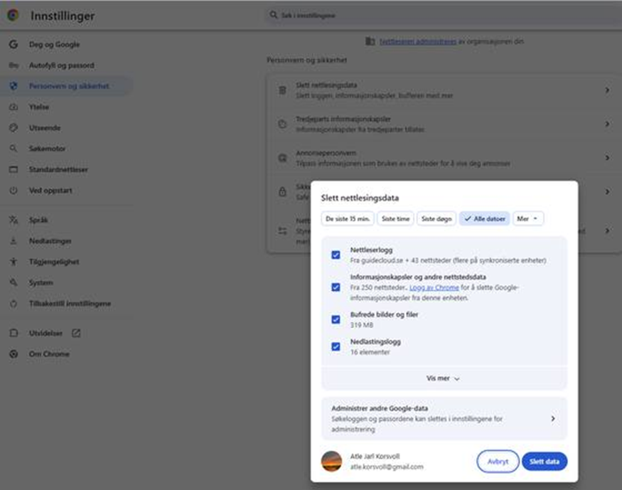 En side med mye god og viktig informasjon er Nettvett som for eksempel anbefaler disse framgangsmåtene: https://nettvett.no/slik-tommer-du-nettleserdata/ og https://nettvett.no/slik-administrer-du-informasjonskapsler/