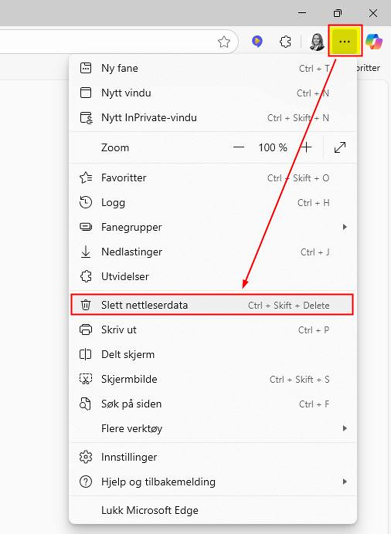 Åpne Edge og trykk på hurtigtaster CTRL + Shift + Del eller Innstillinger og mer (knapp med tre prikker):