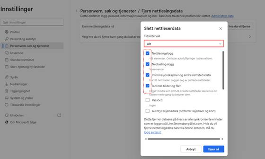 I vinduet Slett nettleserdata velger du først Tidsintervall fra nedtrekksmenyen Marker det du ønsker å fjerne (du kan scrolle nedover for å se flere alternativer), og trykk på Fjern nå: