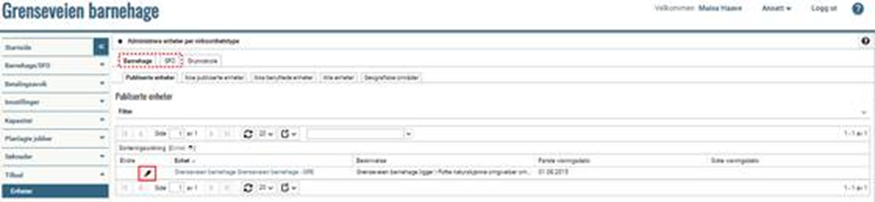 Gå til menypunktet Tilbud > Enheter Gå til fanen Barnehage (eventuelt SFO). Informasjonen som registreres her blir synlig i publikumsportalen under Mer info Klikk på endreikonet: