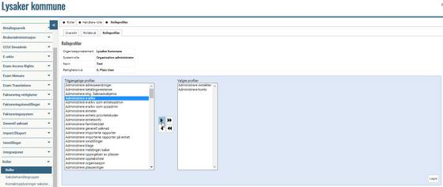 Gå til "Roller" --> "Roller" og trykk på rollen som skal endres. Gå til fanen Rolleprofiler. Marker profilene du ønsker Før de over til feltet Valgte profiler ved å trykke på piltasten i midten: