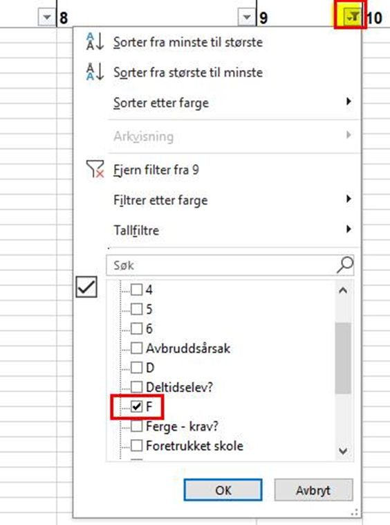 Jeg setter også filter på kolonne 9 hvor jeg fjerner markering for (Merk alt) og haker av for F: