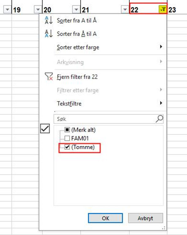 I kolonne 22 fjerner jeg markering for alt unntatt (Tomme):