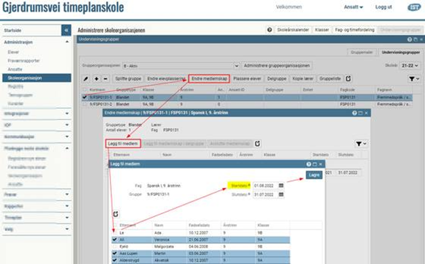 Gå til Administrasjon > Skoleorganisasjon > Undervisningsgrupper > fane Undervisningsgrupper. Marker aktuell gruppe og klikk på Endre medlemskap. Klikk på Legg til medlem Marker elevene du skal koble til undervisningsgruppen Kontroller at Startdato for gruppemedlemskapet er korrekt (01.08.20XX dersom det skal gjelde for hele skoleåret) Klikk Lagre