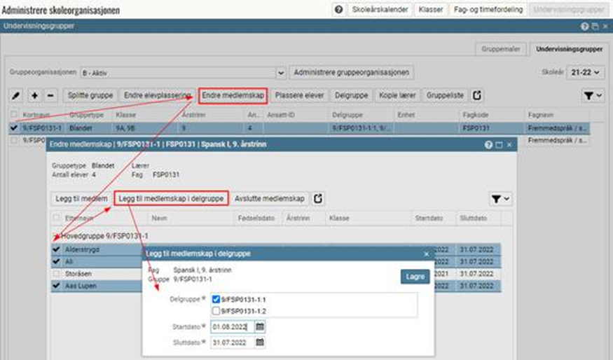 Marker undervisningsgruppen (hovedgruppen) og klikk på Endre medlemskap. Marker de elevene som skal i samme delgruppe. Klikk på Legg til medlemskap i delgruppe. Marker delgruppen elevene skal kobles til, sett riktig startdato og klikk Lagre: