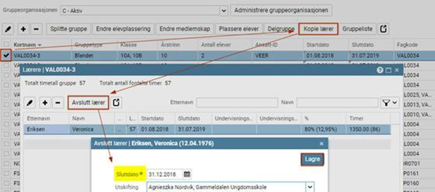 Gå til Administrasjon > Skoleorganisasjon > fane Undervisningsgrupper Sett filter for å finne gruppen du skal endre faglærer. Marker en gruppe og klikk Kople lærer. Marker lærer som skal slutte og klikk Avslutt lærer. Sett inn Sluttdato (siste dag læreren har gruppen). Velg lærer som skal overta gruppen fra plukklisten Utskifting (læreren får automatisk Startdato dagen etter forrige lærers Sluttdato). Klikk på Lagre