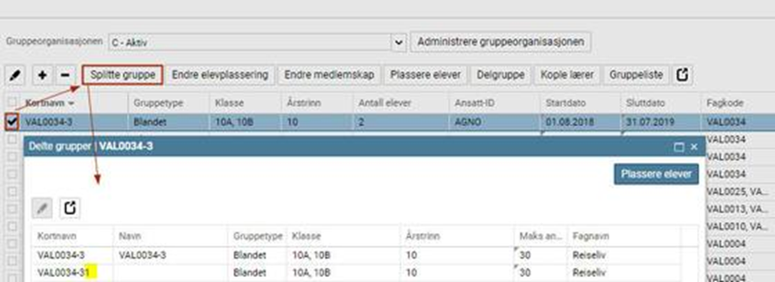 Gå til Administrasjon > Skoleorganisasjon > Undervisningsgrupper > fane Undervisningsgrupper Sett filter for å finne gruppen du ønsker å dele. Marker gruppen og klikk på Splitte gruppe. Du får en melding om du ønsker å lage en lik gruppe, svar Ja. Du får opp et bilde som viser at en ny gruppe er opprettet med samme navn, men med ett ekstra tegn (1-tall):