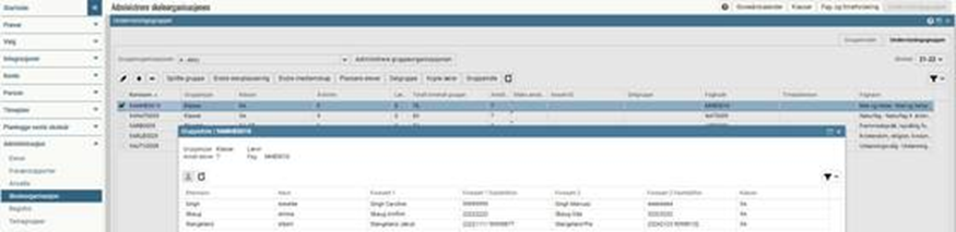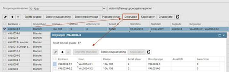 Du kan ha en undervisningsgruppe som igjen er delt i delgrupper. Dette er spesielt fordelaktig i forhold til å legge timeplan. Det kan f.eks. være hvis elevene har undervisning i hel klasse en time i uken og i mindre delgrupper en annen time i uken. Elever kan delta både i hovedgruppen og i delgruppen(e). Timene kan kobles til alle faglærere i faget eller fordeles mellom dem.