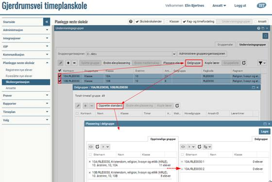 Det er også mulig for en skole å lage delgrupper på tvers av klasser for undervisningsgrupper som har gruppetype Klasse. Eksempel: En skole har undervisningsgruppe med gruppetype Klasse for hhv klasse 10A og 10B i RLE. Skolen ønsker tre delgrupper på tvers av klassene.