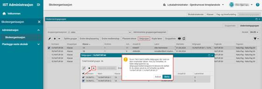 Selv om startdatoen er passert er det mulig å slette en delgruppe med gruppemedlemmer (tilkoblede elever). I de tilfeller hvor skolen ser at det finnes delgrupper de ikke har bruk for, kan disse slettes fullstendig i stedet for å avslutte delgruppen med sluttdato slik at det skapes historikk. Dette gir ryddigere data i organisasjonen.