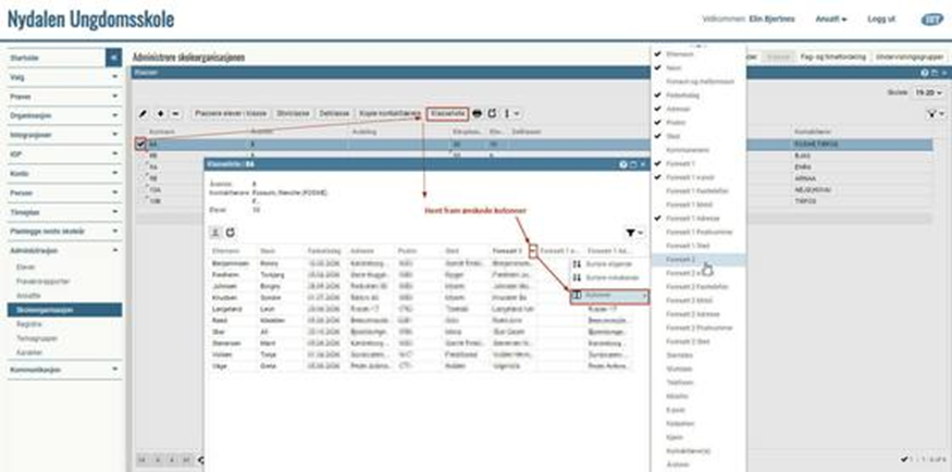 Gå til Administrasjon > Skoleorganisasjon > Undervisningsgrupper > fane Undervisningsgrupper Marker aktuell gruppe og klikk på Gruppeliste. Hent fram ønskede kolonner ved å trykke på den lille pilen på en av kolonneoverskriftene og deretter velge kolonner i listen som vises: