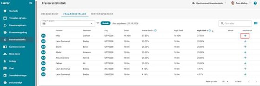 Gå til Fraværsstatistikk > fane Fraværsdetaljer Velg klasse i plukklisten. Finn riktig elev og aktuell fagkode før du klikker på plusstegnet i kolonnen Send varsel. Hent fram kolonnen med kolonnevelger-knappen hvis den ikke er synlig.