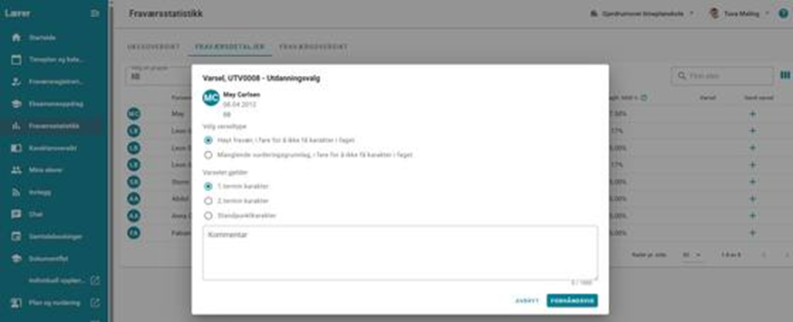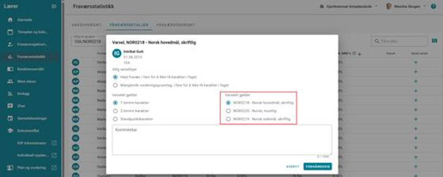 Hvis du vil kan du skrive en kommentar med mer utfyllende informasjon om varselet (vises for eleven og foresatte for elever under 18 år):