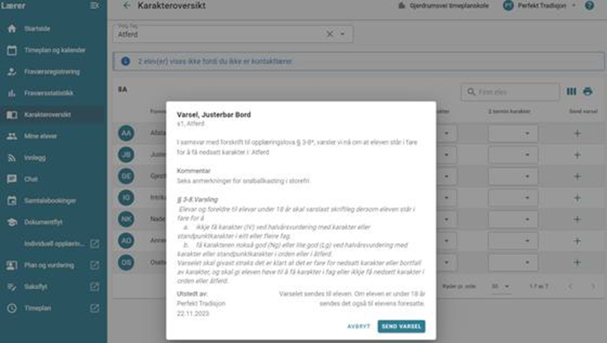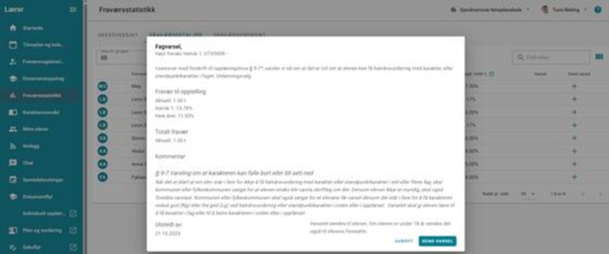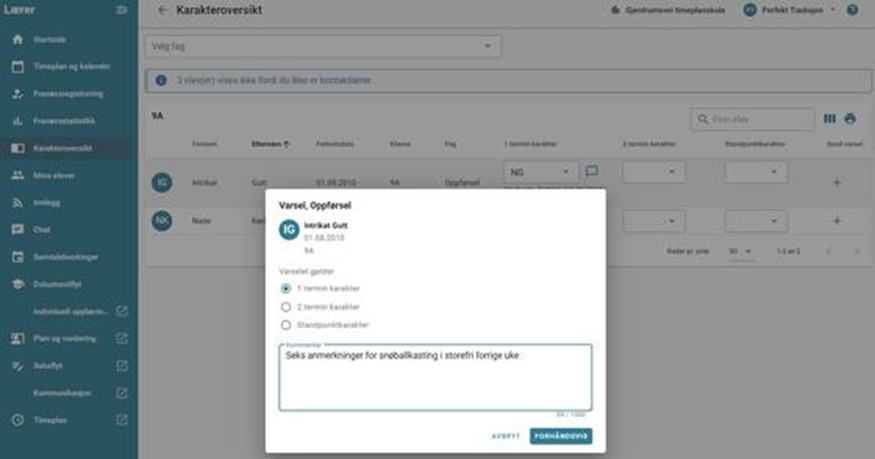 - Gå til Karakteroversikt velg klasse/varseltype.