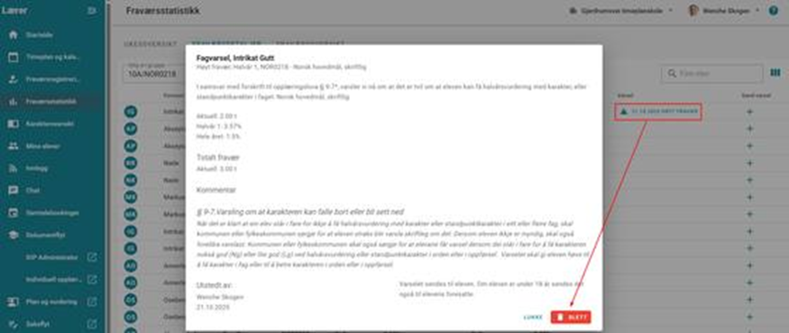 - Trykk på Slett og bekreft slettingen med Varselet er slettet og e-post har blitt sendt til elev/foresatte om at varselet er slettet.
