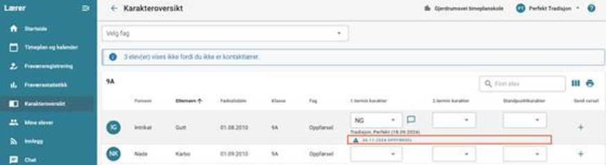 Et varsel i orden eller oppførsel som er generert/sendt vises i Karakteroversikt under den karaktertypen det gjelder (1. termin, 2. termin eller standpunkt):